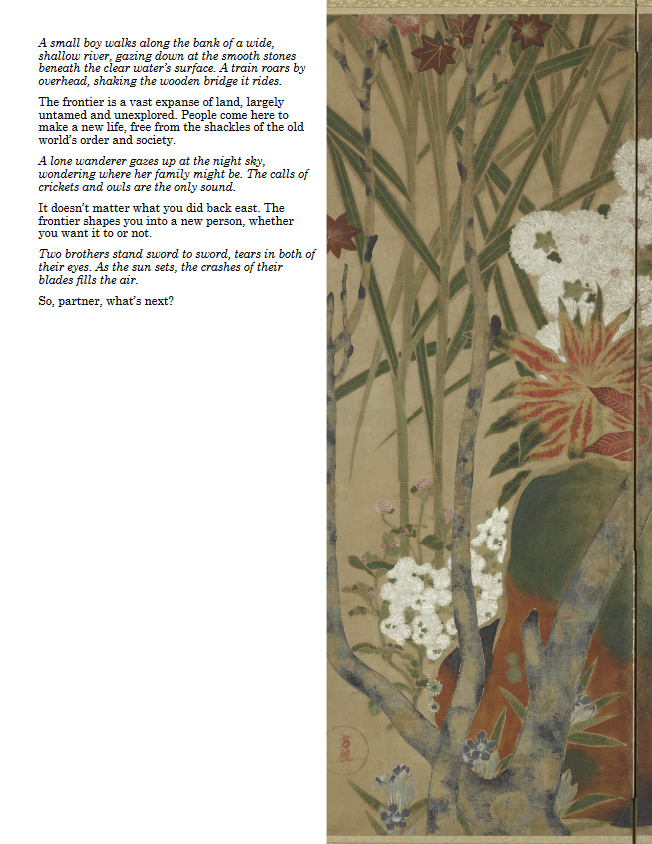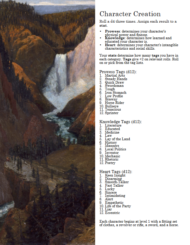 Setting information is light, allowing you and your group to decide what "cowboy samurai" means. If all that legwork sounds like too much work, I don't blame you. I plan on expanding upon the "default setting" in the future with tables and lore.